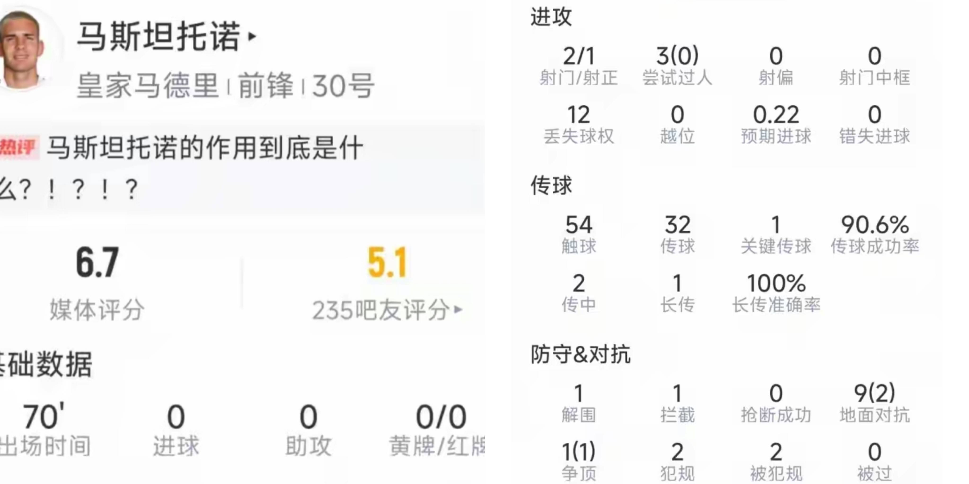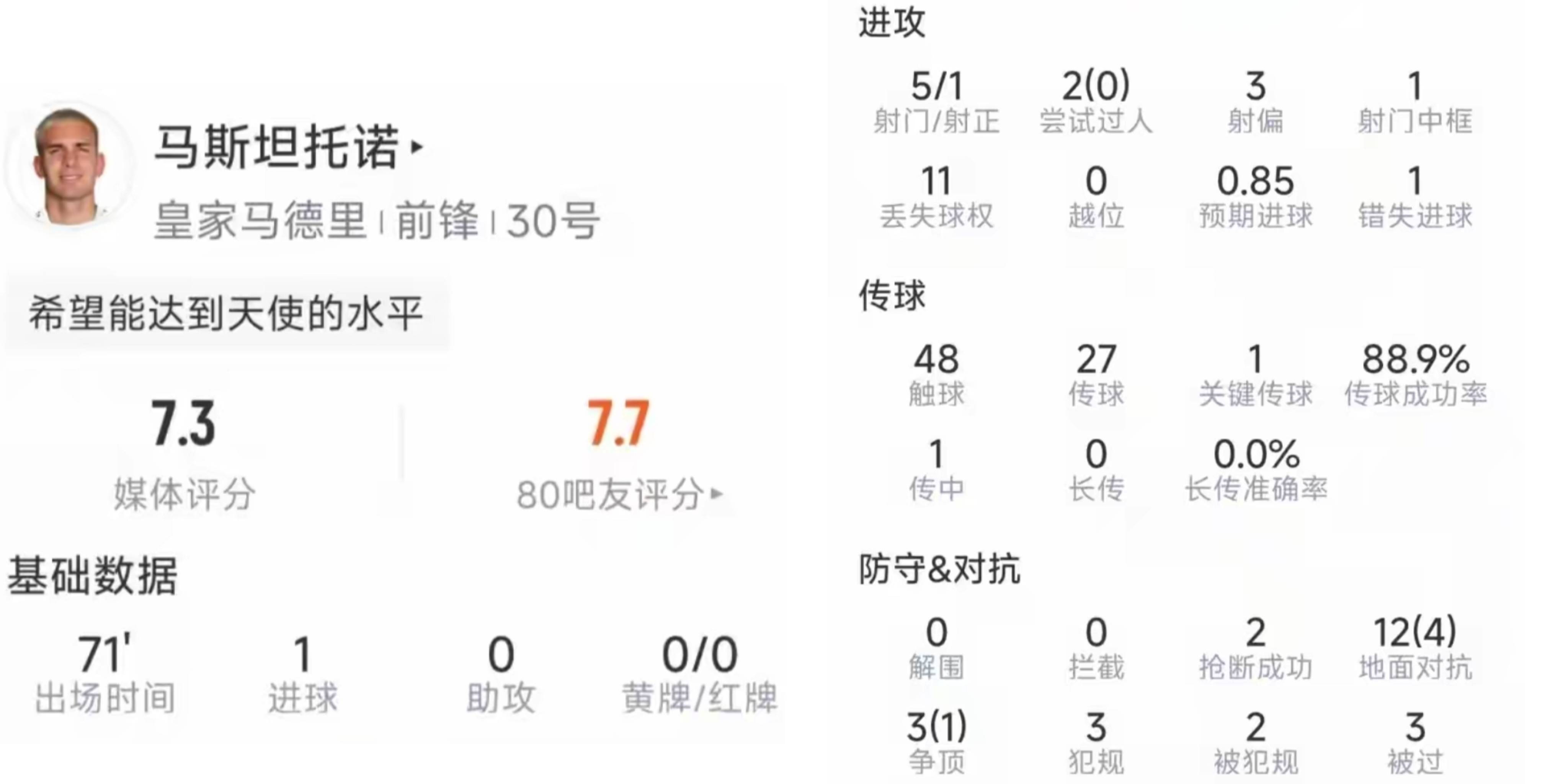 第二场,二零二五-26赛季西甲联赛第6轮,皇马对阵莱万特的比赛。本场比赛马斯坦托诺首发登场,第71分钟被替换下场。进攻端5次射门1次射正,2次尝试过人0成功,1次射门中框,预期进球0.85,错失1次进球;传球端48次触球,27次传球,1次关键传球,传球成功率88.9%,无长传;防守端2次抢断成功,12次地面对抗仅4次成功,3次争顶1次成功,3次犯规,2次被犯规,3次被过;媒体评分7.3,吧友评分7.7,球迷期待其达到天使迪马利亚的水平。