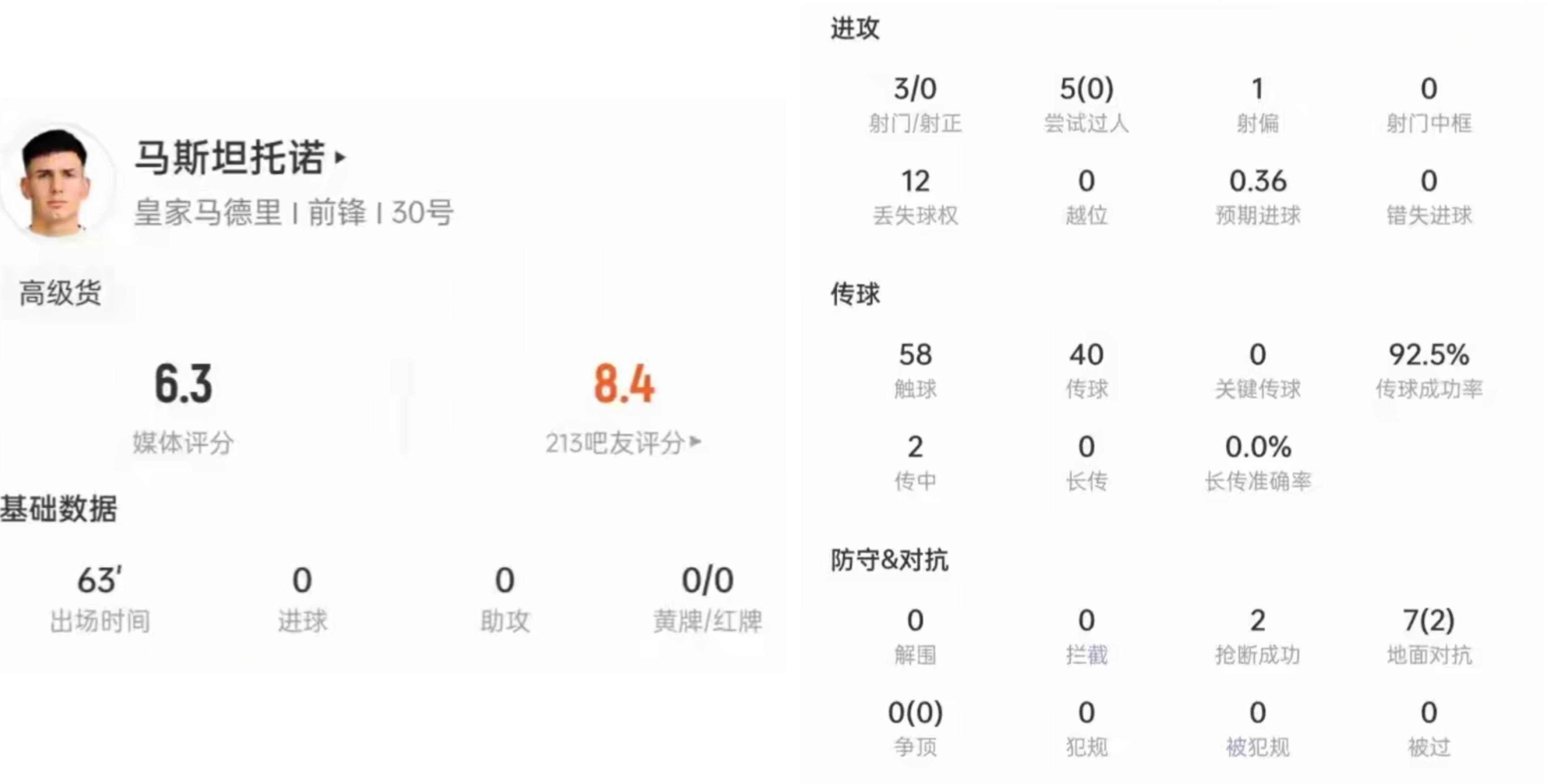 第一场,二零二五-26赛季西甲联赛第2轮,皇马对阵皇家奥维耶多的比赛。本场比赛马斯坦托诺首发登场,第63分钟被替换下场。进攻端3次射门0射正,5次尝试过人0成功;传球端58次触球,40次传球,传球成功率92.5%,无关键传球、长传;防守端2次成功抢断,7次地面对抗仅2次成功,无解围、拦截、犯规等。媒体评分6.3,吧友评分8.4,体现球迷对其期待值较高。